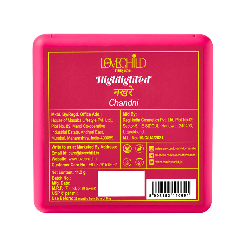 Improve your glow game with the magnificent "Highlighted Nakhre" highlighter palette from Lovechild by Masaba. Champagne Gold, Rose Gold, Deep Pink, and Classic Gold are four exotic hues made for fair to medium skin tones that will help you channel your inner diva and highlight your cheekbones. This shimmery highlighter creates a 3D rainbow reflection that gives your face an all-occasion glow. A flawless blend is guaranteed by the high-beaming radiance cream-to-powder composition, which gives you a stunning 100 watts of shine. The best thing, though? This Highlighter Palatte is vegan! Be the centre of attention at any gathering by embracing the deep hues and dramatic strobing and letting your nakhras shine with this Shimmery Highlighter. Prepare to exude confidence and attractiveness, drawing enthralled gazes wherever you go. Embrace your "nakhras" and be the luminous 'Chandni' of the party! Shop the Face Highlighter and embrace your radiant glow today!