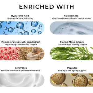 "Aqua, Caprylic Capric Triglyceride, PEG-100 Stearate (and) Glyceryl Stearate, Glycerine, Ethylhexyl Methoxycinnamate (and) Benzophenone-3 (and) Phospholipids (and) 1,3-Butylene Glycol, Dimethicone (and) Dimethicone/PEG-10/15 Cross polymer, Iso Propyl Myristate, PEG 400 mono Stearate, Caprylic/Capric Triglyceride, Stearalkonium Hectorite, Propylene Carbonate, Cetyl alcohol, Dimethicone, Phenoxyethanol (and) Ethylhexylglycerin, Polyacrylamide & C13-C14 Isoparffin & Laureth-7, Sodium Acrylates Copolymer (and) Lecithin, Hydrogenated Polyisobutene, Fragrance, Phospholipids (and) Glycine Soja (Soybean) Oil (and) Glycolipids (and) Glycine Soja (Soybean) Sterols, Polymethylsilsesquioxane, Butyrospermum Parkii (Shea) Butter, Theobroma Cacao Seed Butter, Argania Spinosa Kernel Oil (argan oil), Sodium Hyaluronate, Niacinamide, Laminaria Digitata Extract, Cetyl-PG Hydroxyethyl Palmitamide, Ceramide 1, Ceramide 2, Ceramide 3, Ceramide 4, Ceramide 6 II, Tricholoma mushroom Extract, Punica granatum (Pomegranate) Extract, Acetyl Hexapeptide 8 (and) Copper Tripeptide 1 (and) Palmitoyl Pentapeptide 4 (and) Tripeptide 1 (and) Hexapeptide 9 (and) Palmitoyl Tripeptide 1, Disodium EDTA, Tocopheryl Acetate, CI 77491, CI 77492 , CI 77499, CI 77891